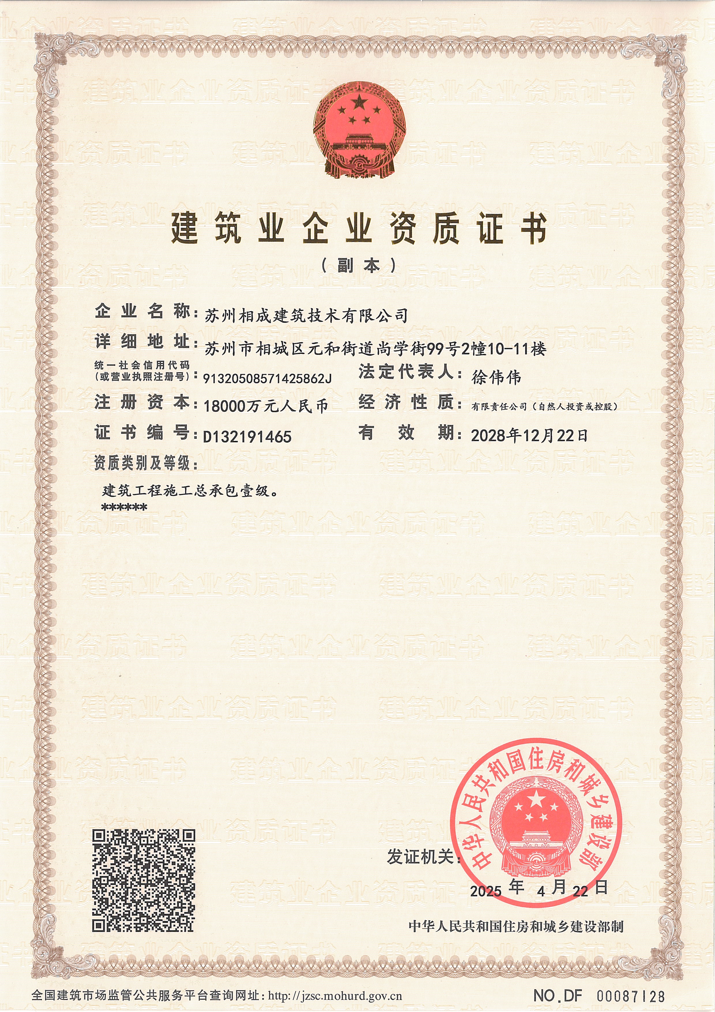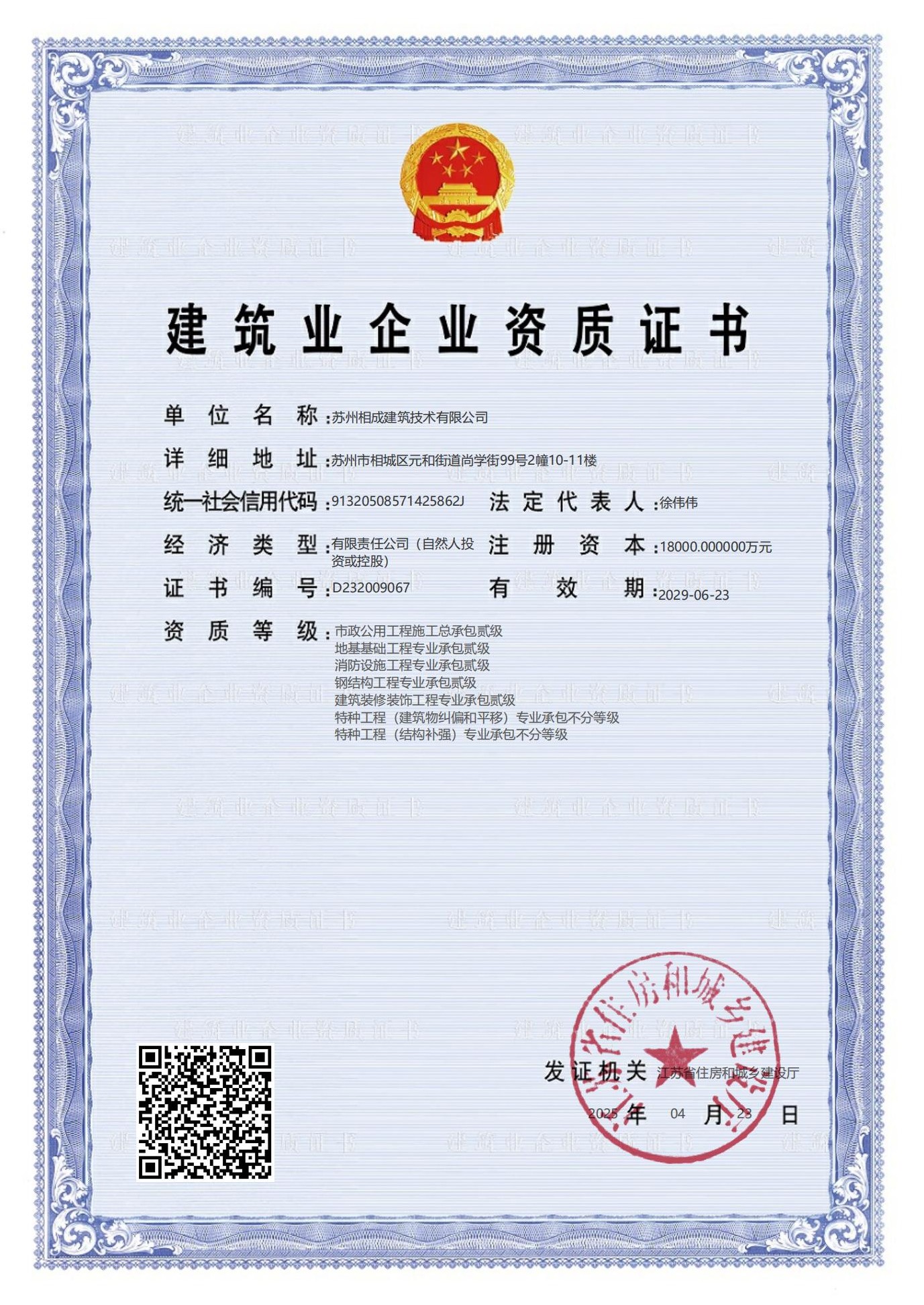 蘇州相成建筑技術(shù)有限公司是一家以提供建筑開發(fā)服務為主的建筑企業(yè),公司位于蘇州市相城區(qū),成立于2011年3月,注冊資本 10000萬,歷經(jīng)13年的努力于2022年7月獲省住建廳頒發(fā)房屋建筑工程施工總承包壹級資質(zhì),市政公用、建筑裝飾、地基基礎(chǔ)、消防設(shè)施、鋼結(jié)構(gòu)工程等專業(yè)承包二級資質(zhì); 2023 年6月份增設(shè)房屋建筑工程監(jiān)理甲級、市政一級監(jiān)理資質(zhì);目前是相城區(qū)唯一一家集施工總承包一級和建筑工程監(jiān)理甲級資質(zhì)的企業(yè)。